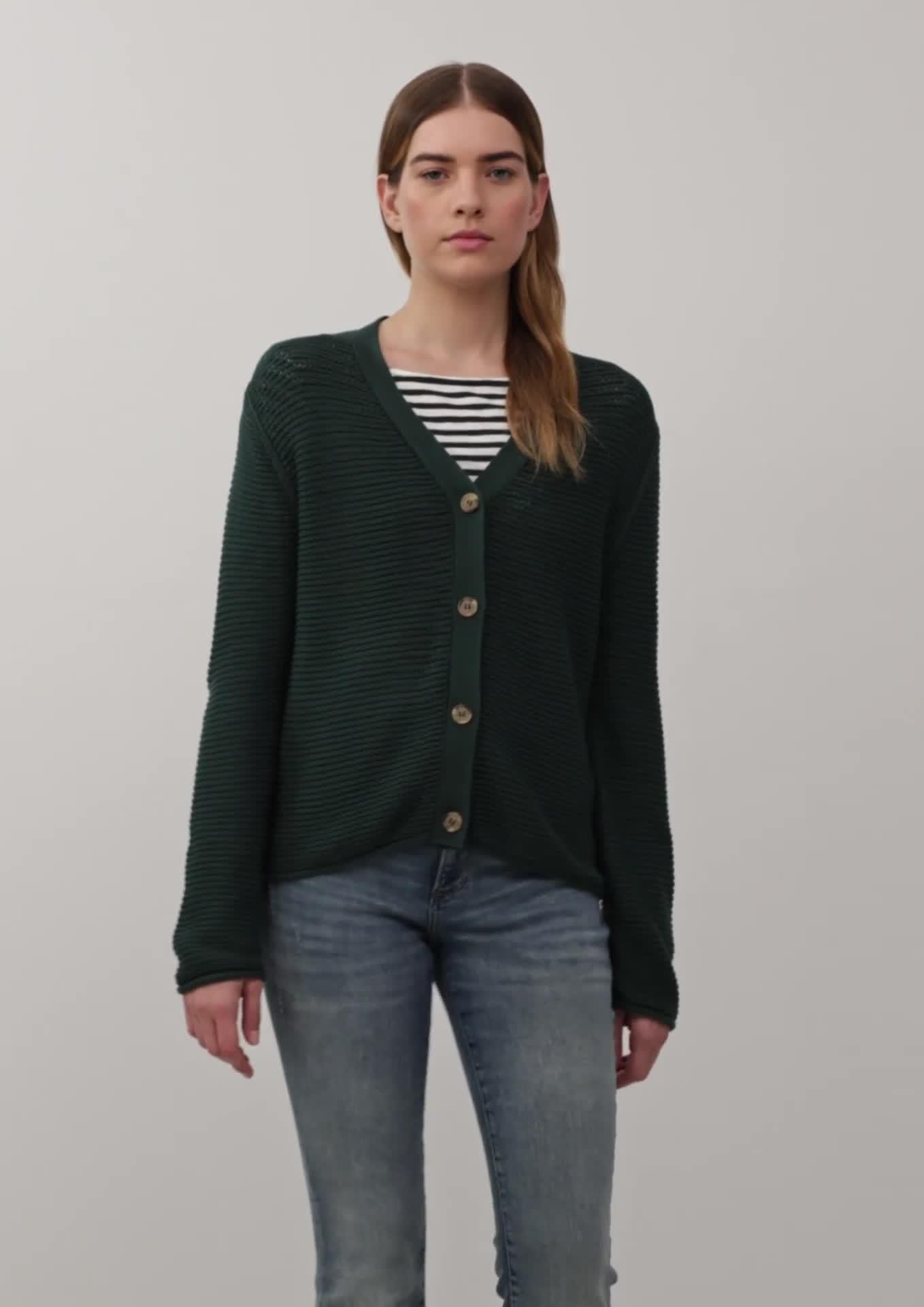 Tento vzdušný, měkký svetr nadčasového regular střihu vás okouzlí elegantním výstřihem do V a ozdobným žebrovaným vzorem. Zapínání na knoflíky z něj dělá ideálního společníka pro volné chvíle.